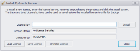 After clicking the "Load Licence" button, MyCourts will use the internet to authenticate the code you have entered. If successful, the License Status text will change to "License Installed".